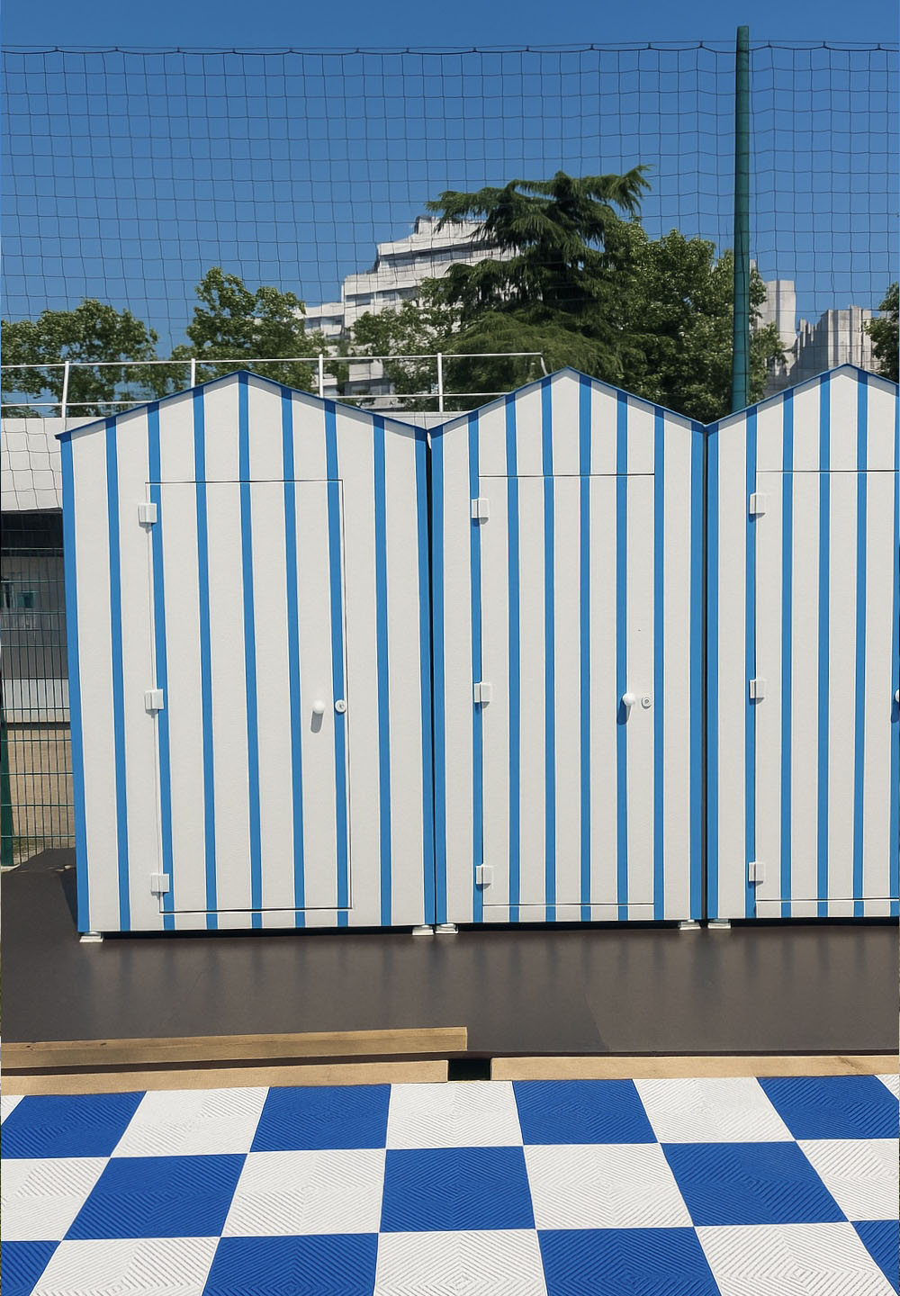 Au-delà du littoral, la cabine de plage s’invite aussi en ville. Installée dans les parcs, bases de loisirs ou aires sportives, elle offre des solutions pratiques pour se changer, stocker du matériel ou accueillir le public.