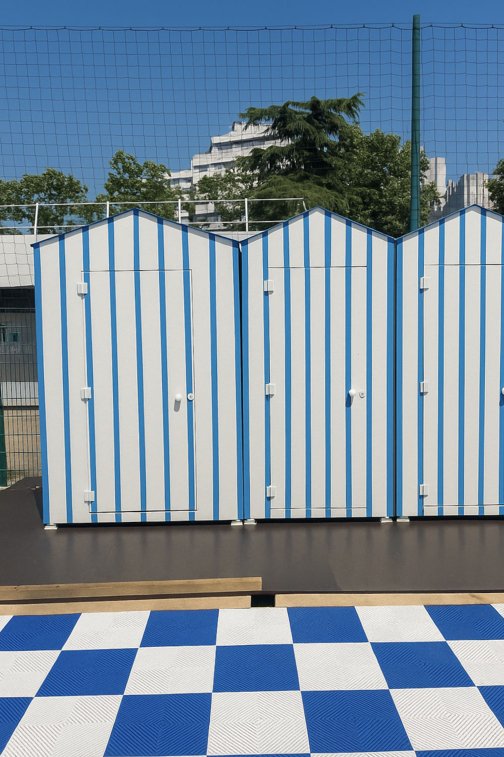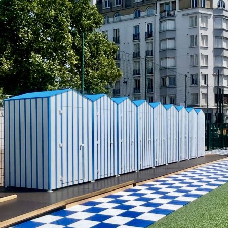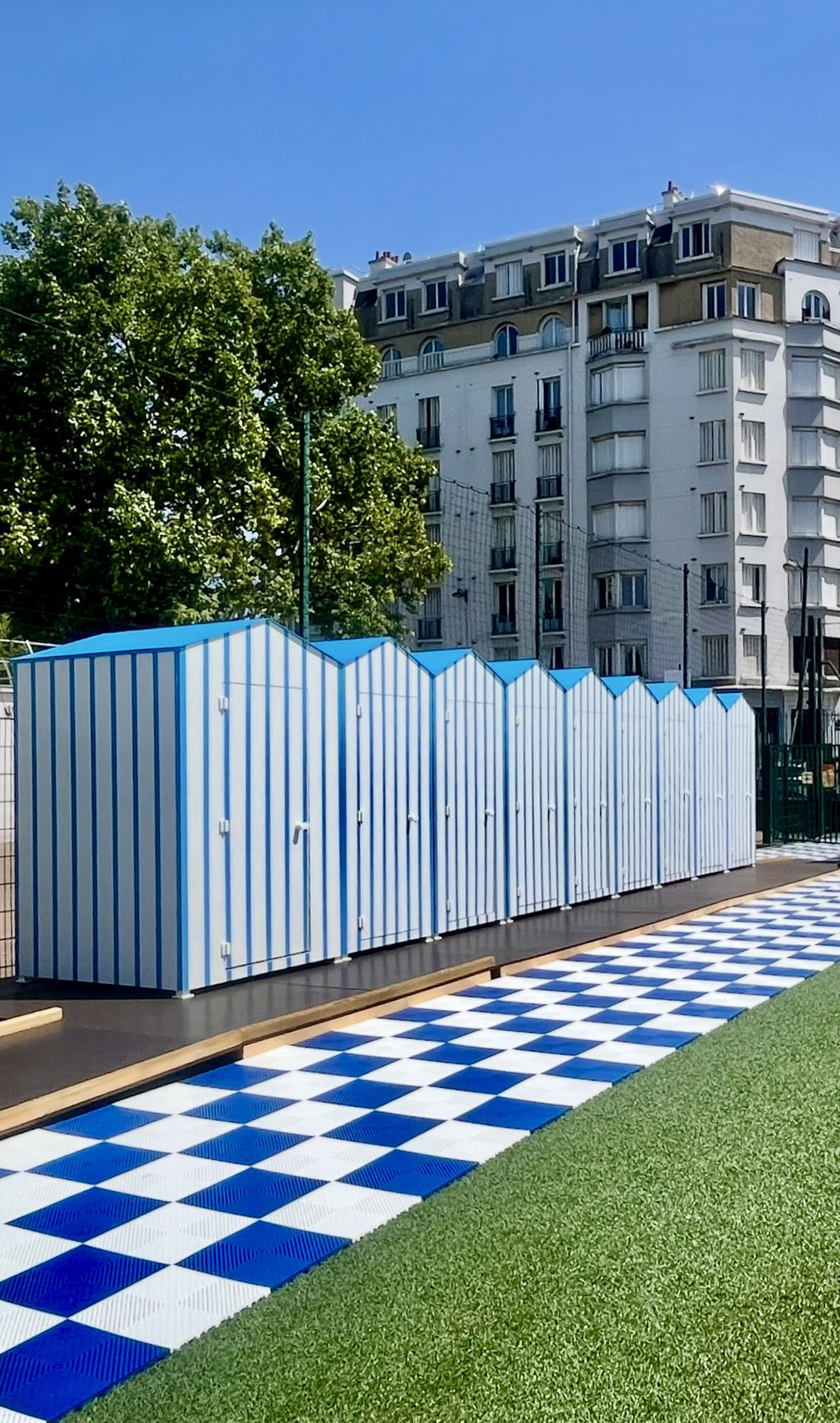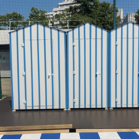 L’installation de ces cabines (de plage) Onlywood a permis de transformer un stade de football en véritable zone de baignade éphémère, créant un espace estival agréable et inclusif. Ce projet illustre l’engagement de la Ville de Paris pour une ville plus accessible, plus conviviale et plus durable